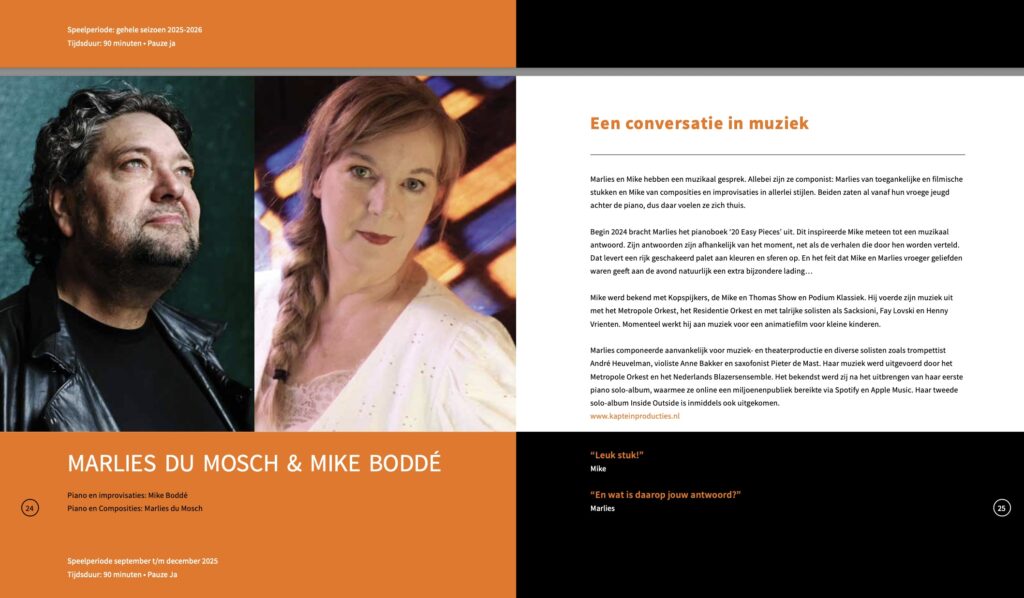 2025-11-06 | 20:15 | Theater Koningshof | Maassluis | Zuid Holland | https://www.theaterkoningshof.nl/agenda/2732/marlies-du-mosch-mike-bodde/een-conversatie-in-muziek |